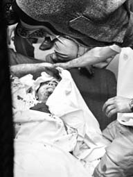 Reporteros auxilian al camarógrafo español José Couso -quien murió- del canal Tele 5, tras el ataque de un tanque estadunidense en Bagdad al hotel Palestina FOTO AFP