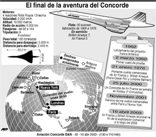 Las aerolíneas British Airways y Air France dijeron este jueves que retirarán su flota de aviones Concorde a finales de octubre, poniendo fin a 27 años de vuelos comerciales supersónicos. Las dos únicas aerolíneas del mundo que vuelan el Concorde señalaron que la decisión de retirar esas naves se debía al deterioro de los ingresos en sus rutas transatlánticas, en contraste con el aumento de los gastos de mantenimiento. La noticia se conoce casi tres años después de que un Concorde de Air France se estrelló cerca de París, accidente que causó la muerte a 113 personas y obligó a ambas aerolíneas a pagar costosas modificaciones al jet cuatrimotor. British Airways, la mayor aerolínea de Europa, dijo que retirar las siete naves le costará 84 millones de libras esterlinas (130.5 millones de dólares), que serán agregados a los gastos del año fiscal que finalizó en marzo