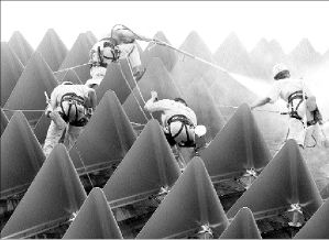Trabajadores limpian el domo del Teatro de Singapur, en el explanada del mismo nombre. La economía de la isla fue afectada en el primer trimestre por la muerte de personas causada por la neumonía atípica y varias empresas terminaron la semana con pérdidas FOTO AFP