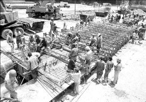 que van y vienen con sus cargas de concreto, y con máquinas de tensión