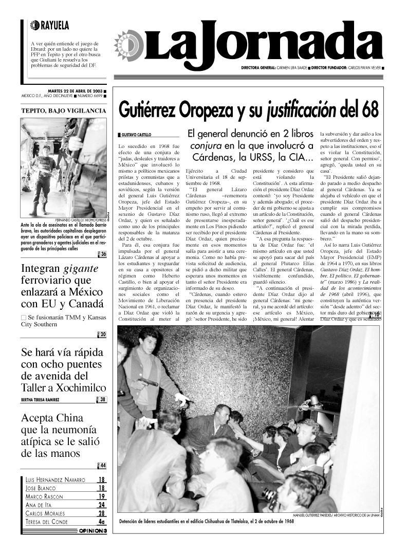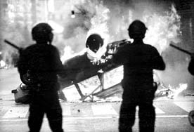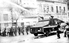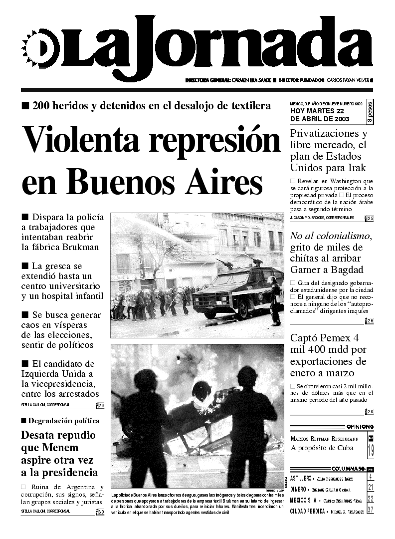 La policía de Buenos Aires lanza chorros de agua, gases lacrimógenos y balas de goma contra miles de personas que apoyaron a trabajadores de la empresa textil Brukman en su intento de ingresar a la fábrica, abandonada por sus dueños, para reiniciar labores. Manifestantes incendiaron un vehículo en el que se habían transportado agentes vestidos de civil FOTOS REUTERS Y AFP