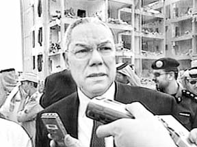 En una imagen de televisión, el secretario de Estado, Colin Powell, recorrió el complejo habitacional atacado con coches bombas la noche del lunes en Riad, donde viven empleados de una empresa estadunidense que participa en la formación de la Guardia Nacional saudita desde hace tres décadas. "Fue un acto terrorista bien planificado", aseguró el funcionario FOTO REUTERS