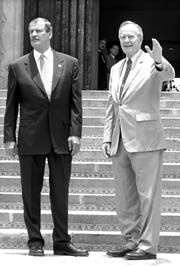 Vicente Fox recibió ayer en Los Pinos a George Bush padre. Sobre la reunión, el canciller Luis Ernesto Derbez dijo que el ex presidente estadunidense afirmó que entre su hijo y el mandatario mexicano persiste un "profundo cariño" FOTO MARCO PELAEZ
