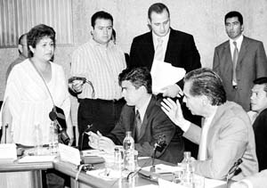 Emma Villaseñor, hermana de uno de los 19 migrantes que murieron en un tráiler en Victoria, Texas, interrumpió la conferencia de Luis Ernesto Derbez (sentado, a la derecha) en la Secretaría de Relaciones Exteriores para denunciar la indiferencia de autoridades de esa dependencia. Señaló que cuenta con la información sobre los nombres de los polleros que contactaron y abandonaron a su familiar FOTO LA JORNADA