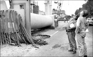 DISTRIBUIDOR VIAL ZARAGOZA  Aspecto de la columna que se desprendió ayer durante los trabajos para su colocación FOTO CARLOS CISNEROS