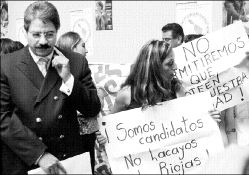 Mientras en la sesión de plenos del IFE se ventilaba el debate y se exigía la cancelación del registro al PSN, en el lobby de acceso al salón decenas de candidatos del PSN llegaron a protestar contra su dirigente, Gustavo Riojas. Sigilosamente pidieron hablar con él, y cuando acudió a escucharlos desplegaron sus mantas que cuestionaban su "presidencia imperial" y le reclamaban que "distribuyera el dinero de la campaña entre los candidatos, porque solamente les había repartido 10 mil pesos a cada uno".