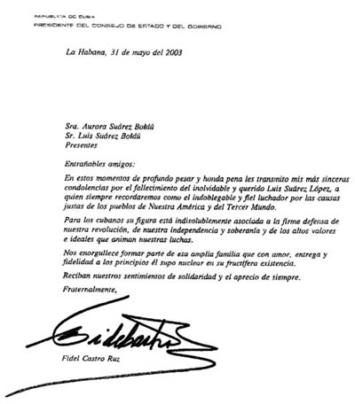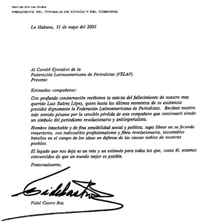El presidente de la República de Cuba, Fidel Castro Ruz, envió ayer dos misivas. Una a la Federación Latinoamericana de Periodistas (Felap) y otra a la señora Aurora Suárez Boldú y a Luis Suárez Boldú, hijos del periodista Luis Suárez López, quien ayer falleció en esta ciudad. A continuación se presenta el texto íntegro de las cartas: