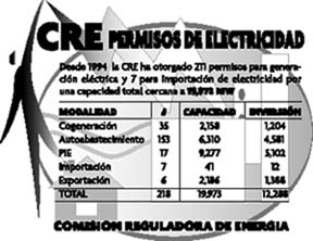 Desde 1994 la CRE ha otorgado 211 permisos para generación eléctrica y siete para importación de electricidad por una capacidad total cercana a 19 mil 973 megavatios. De estos, 35 han sido para participar en la modalidad de cogeneración; 153 para autoabasto; 17 para productores independientes; siete para importación y los seis restantes parta exportación de fluido eléctrico. Con las autorizaciones otorgadas a los productores extranjeros de energía se espera obtener inversiones directas por alrededor de 12 mil 288 millones de dólares.