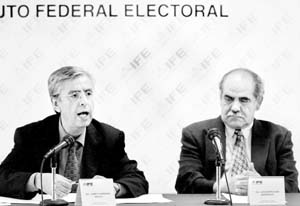 Jaime Cárdenas y José Barragán, consejeros del Instituto Federal Electoral, durante la conferencia de prensa en la que demandaron que el organismo profundice las averiguaciones sobre Amigos de Fox. Propusieron citar al Presidente para que informe sobre los fondos de su campaña y a Ernesto Zedillo para que aclare lo que supo sobre el presunto lavado de dinero en los fondos del entonces candidato panista FOTO GUILLERMO SOLOGUREN