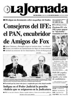 Jaime Cárdenas y José Barragán, consejeros del Instituto Federal Electoral, durante la conferencia de prensa en la que demandaron que el organismo profundice las averiguaciones sobre Amigos de Fox. Propusieron citar al Presidente para que informe sobre los fondos de su campaña y a Ernesto Zedillo para que aclare lo que supo sobre el presunto lavado de dinero en los fondos del entonces candidato panista FOTO GUILLERMO SOLOGUREN