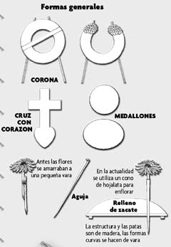 En el pasado se utilizaron principalmente margaritones y rosas; en la actualidad se emplean además crisantemo, nardos, gladiola y nube; como fondo se coloca follaje. Las flores son blancas, como símbolo de respeto a la pureza del alma del difunto. Las formas más comunes siguen siendo coronas y guirnaldas, aunque puede haber medallones de forma elíptica, cruces y cruces con corazón. Las cruces y el morado vienen de la tradición católica; significan luto. Los medallones redondos se usan también para adornar salones de fiesta, principalmente para las bodas. A las ofrendas para muerto se le puede colocar un listón blanco o morado, casi siempre con letras doradas, con el nombre o la organización que las presenta. Se dice que originalmente los rayos que se forman con la palma camedor recortada y que rodean la corona, estaban ligados con los rayos de Apolo, pues en Grecia las coronas se ofrecían a los dioses; el follaje variaba de acuerdo con la deidad.