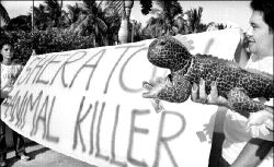 Unas 30 personas, encabezadas por Sara Rincón Gallardo, presidenta de la Sociedad Protectora de Animales, clausuraron de manera simbólica las instalaciones del hotel Sheraton, en protesta por la matanza de más de 500 iguanas, efectuada el 5 de junio pasado, por orden del gerente del centro de hospedaje, Dieter Roesler, quien argumentó que los reptiles invadieron el lugar y "molestaban a los turistas". Los activistas exigieron la renuncia del directivo del hotel, y recordaron que la iguana es una especie protegida por las normas oficiales mexicanas, pues está en peligro de extinción.