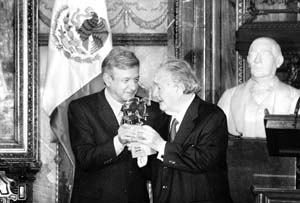 Andrés Manuel López Obrador, jefe de Gobierno del Distrito Federal, entrega el galardón al historiador y presidente honorario del Consejo Consultivo del Centro Histórico por sus aportaciones al rescate de la zona. La distinción también fue otorgada a Paul Reichmann, creador de la Torre Mayor, y a la familia de Saúl Cornejo Hernández, el obrero que pereció en las obras del distribuidor vial San Antonio FOTO MARIA LUISA SEVERIANO