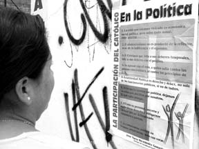 "No hay que apoyar con el voto, a quien valla contra las propias convicciones, ni contra los principios de fe", se lee en uno de los ocho puntos de un cartel difundido en Nezahualcóyotl, titulado La participación del católico en la política, cuya autoría se adjudica a la diócesis de ese municipio mexiquense. En tanto, el obispo de San Cristóbal de las Casas, Chiapas, Felipe Arizmendi Esquivel, propuso a partidos, candidatos, gobierno y "enemigos" no temer competencia por parte de los jerarcas de la Iglesia, quienes "no ambicionan" poder político, social o económico FOTO VISOR CUATRO