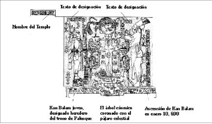 ![]() Figura 5. Entronización de K'inich Janaab Pakal I en la llamada Tableta Oval de Palenque. El joven ajaw, sentado en el Trono de Jaguar, recibe de su madre el tocado real. Como se advierte, debajo de esta Tableta está el trono real donde fueron entronizados los soberanos que siguieron a Pakal. |