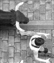 Un hombre corre delante de un toro durante el sexto encierro en la Feria de San Fermín, en Pamplona, en el que dos personas resultaron cornadas y cinco más heridas levemente FOTO AFP