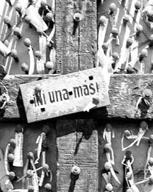 Los cuerpos de las víctimas fueron enterrados en el desierto de San Isidro; un hombre que las acompañaba permanece desaparecido. Casi una treintena de organizaciones ciudadanas reclamaron reabrir los casos de homicidios seriales en esa ciudad fronteriza. En la imagen, una cruz fue colocada en el puente internacional de cruce a El Paso, Texas FOTO CARLOS RAMOS MAMAHUA