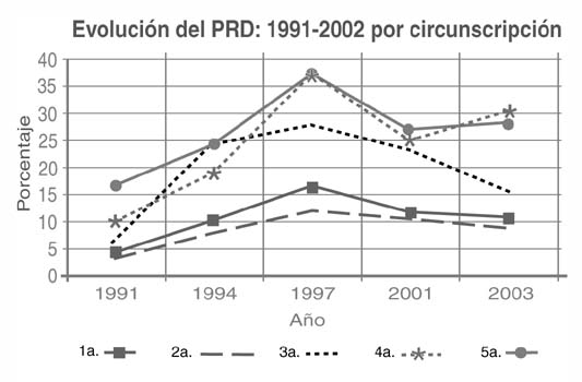 Las elecciones de 1994 significan un incremento muy importante, pero sólo en las circunscripciones cuarta y quinta, donde se coloca alrededor de 25 por ciento de la votación, y por primera vez gana terreno en la tercera circunscripción, donde Chiapas juega un papel importante debido al movimiento zapatista. En 1997 el PRD alcanza su más alta votación en toda la República, sobre todo en la cuarta circunscripción, probablemente por la elección local en el Distrito Federal, que gana Cárdenas, pero en el norte y noroeste no pasa de 15 por ciento. En 2000, cuando Cárdenas vuelve a ser candidato a la Presidencia de la República, baja la votación en todas las circunscripciones, pero destaca la ausencia del partido en el norte, centro y noroeste. Por cierto que en ese resultado adverso habría que considerar, además de las controvertidas elecciones internas de 1999, la estrategia de campaña y de alianzas de 2000.