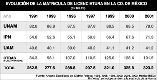 Los resultados del pasado examen único, agregó, están a la vista: "más de cien mil jóvenes desplazados; 40 mil quedaron eliminados por no cumplir con algún requisito y, como en años anteriores, son las mujeres las que ingresan en menor número a la educación media superior". Por otra parte, la SEP "no ha impulsado la ampliación de la educación superior: la última universidad federal creada en la ciudad de México es la UAM, que data de hace 30 años (no mencionó a la Universidad de la Ciudad de México), mientras que pide a las otras instituciones, de manera expresa, no aumentar la matrícula, en favor de la educación privada".