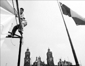 EQUILIBRIO  Un trabajador retira una lona que se utilizó durante un concierto reciente en el Zócalo FOTO FRANCISCO OLVERA