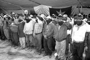 La comandancia zapatista en las primeras horas de hoy, durante la ceremonia de arranque de una nueva etapa de resistencia. Tocó a los comandantes Rafael, Javier y Moisés dar la bienvenida a los asistentes; el segundo declaró la muerte de los Aguascalientes y el tercero anunció el nacimiento de los Caracoles. En tanto, procedentes de diversas regiones de Chiapas, de distintos estados, de varias naciones, miles de personas han llegado a Oventic, donde en el transcurso del día se instalarán las juntas de buen gobierno FOTO JOSE CARLO GONZALEZ