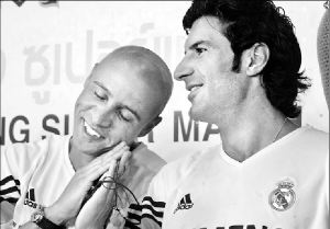 CONVIVENCIA MERENGUE  Roberto Carlos bromea con su compañero del Real Madrid, Luis Figo, durante la conferencia de prensa que dio el equipo español a su llegada a Bangkok, donde terminará su gira por Asia FOTO AFP