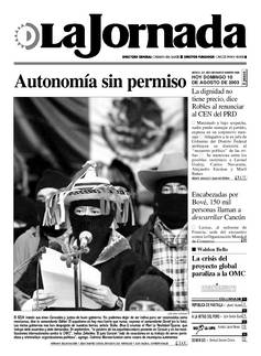 El EZLN instaló sus cinco Caracoles y juntas de buen gobierno. No podemos dejar de ser indios para ser reconocidos como mexicanos, dice la comandanta Esther. El zapatismo es hoy más fuerte que nunca, expresa el comandante David (en la foto). Los malos gobiernos nos han despojado de nuestras tierras, señala Tacho. Brus Li anuncia el Plan La Realidad-Tijuana, que incluye siete acuerdos y siete demandas. En septiembre, "la palabra de los zapatistas estará presente en Cancún y en las movilizaciones internacionales contra la OMC", indica Zebedeo. El juez Garzón "está de vacaciones en su trabajo de cerrar periódicos y criminalizar organizaciones políticas", agrega. Culmina Marcos función como vocero de municipios autónomos FOTO JOSE CARLO GONZALEZ