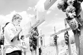 Ocho cruces fueron colocadas ayer en un lote algodonero cerca de Ciudad Juárez, donde fueron hallados los cadáveres de igual número de jovencitas en noviembre de 2001. Familiares de las víctimas colocaron las ofrendas FOTO J. GUADALUPE PEREZ