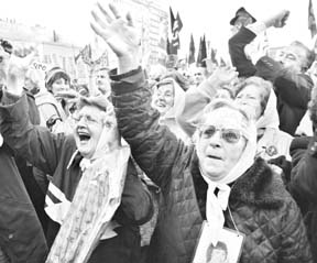 Integrantes de Madres y Abuelas de Plaza de Mayo y otras organizaciones de derechos humanos muestran su alegría frente al Congreso argentino tras la decisión de diputados de anular las leyes de Punto Final y Obediencia Debida, que evitaban el enjuiciamiento de integrantes de la dictadura militar (1976-83), responsables de la desaparición de 30 mil personas FOTO REUTERS
