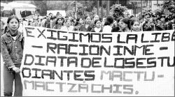 En solidaridad con los alumnos de Chiapas, cientos de estudiantes de la Facultad de Ciencias Sociales de la Universidad Autónoma de Chiapas, de la Escuela Intercultural Jacinto Canek y de otras instituciones efectuaron este jueves una manifestación en San Cristóbal de las Casas. Los alumnos exigieron la "liberación inmediata" de 10 arraigados y 24 consignados e hicieron un llamado al gobierno estatal para que resuelva el problema mediante el diálogo.