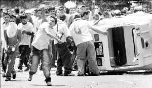 en ese momento un centenar de jóvenes armados con bombas molotov,