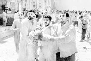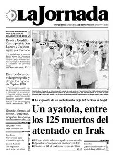 Iraquíes trasladan el cuerpo de una de las víctimas de la explosión de un auto bomba en el templo del imán Ali en Najaf, ciudad santa del chiísmo, al sur de Bagdad. Cien de los heridos fueron reportados en estado ``sumamente grave''. Justo antes del atentado, en su sermón, el ayatola Mohammad Baqr al Hakim había acusado a los partidarios del derrocado presidente Saddam Hussein de los ataques contra las tropas estadunidenses FOTO AFP