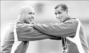Ronaldo y Rivaldo se aprestan a encarar el partido del próximo domingo de Brasil contra Colombia, en el inicio de la eliminatoria sudamericana para Alemania 2006 FOTO AFP