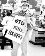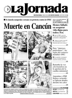 Lee Kyung Hae, líder campesino surcoreano, se encontró con el fotógrafo de La Jornada en un supermercado de Cancún y le entregó su historia de lucha social tres horas antes de asistir a la marcha de protesta de grupos altermundistas, en la que segó su vida con una navaja que se clavó en el corazón. En su mensaje postrero, afirmó: "nuestro destino ya no está en nuestras manos". Actuó portando la pancarta "la OMC mata granjeros". En la manifestación de miles de activistas fueron derribadas varias vallas que impedían el acceso a la llamada zona cero y se desató un enfrentamiento con los cuerpos de seguridad FOTOS JESUS VILLASECA