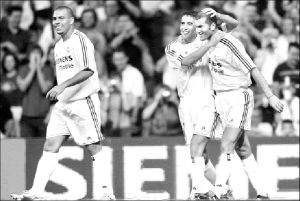 El jugador francés-argelino del Real Madrid Zinedine Zidane (derecha) celebra con Raúl González su anotación, cuarta en el partido de la Liga Española que su equipo ganó 7-2 al Valladolid en el estadio Santiago Bernabeu; adelante de ellos, el brasileño Ronaldo FOTO AFP