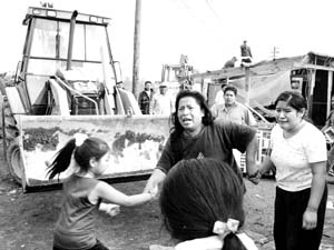 Ocupantes de una de las 22 casas que ayer fueron desmanteladas en el predio conocido como Tempiluli, colonia Ampliación la Conchita, intentan evitar el paso de una pala mecánica. Las autoridades capitalinas señalaron que desde enero recibieron la denuncia de que en la zona ecológica, donde sólo se permiten actividades agropecuarias, se construían viviendas FOTO FRANCISCO OLVERA