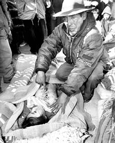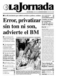 Un agricultor muestra el cadáver de una niña que fue abatida durante el tiroteo entre fuerzas gubernamentales y campesinos para romper un bloqueo carretero en la localidad de Sorata. Los incidentes ocurrieron después de una operación policiaco-militar desplegada el sábado para rescatar a 800 turistas que eran mantenidos en rehenes. Las protestas de los jornaleros se centran en el rechazo a la exportación de gas natural a Estados Unidos FOTO AFP