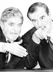 Luiz Inacio Lula da Silva y Vicente Fox en su encuentro en Los Pinos. El mandatario brasileño negó que haya rivalidad con México por un asiento en el Consejo de Seguridad de la ONU FOTO JOSE CARLO GONZALEZ