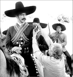 Acaba la secuencia y Alejandro va con sus amigos a platicar. Aún con cananas y pantalón de general, cambia el sombrero revolucionario por una gorra-souvenir de su reciente actuación en Las Vegas, con sus iniciales. Arau saluda de nuevo a la reportera. "¿Ya entrevistaste a Alejandro?" -No me han dejado. "¡Ah, cómo de que no!", dice y, atravesando el set, jala del brazo a esta escribiente. Interrumpe a Fernández de su cotorreo con Zedillo y sus amigos, y le dice: "A ver, Alejandro, esta niña te persigue hace semanas y no ha podido platicar contigo; por favor, hazle caso". Fernández se pone muy serio, cual si le hablara su papá: "Sí, señor". Se pone de pie, camina rumbo a su poltrona e invita a la reportera. Fotógrafos y camarógrafos corren detrás. "¿Todos ellos vienen contigo?", bromea él.