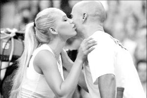 LA BATALLA DE LOS SEXOS  Anna Kournikova saluda a Andre Agassi luego de sostener un partido de dobles en Boston. La rusa y Chanda Rubin perdieron ante el estadunidense y Elton John, en juego de beneficio FOTO AFP