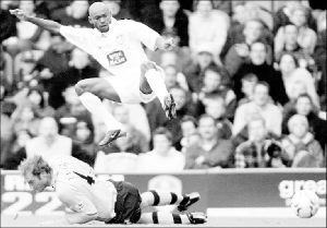 El camerunés Salomón Olembe, del Leeds United, salta ante la marca de Martin Taylor, del Blackburn Rovers FOTO REUTERS