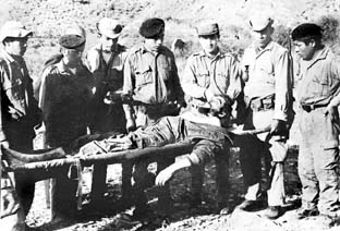 El cadáver del guerrillero argentino-cubano es transportado por soldados bolivianos tras su ejecución en la región de Vallegrande. El aniversario coincide con las movilizaciones de protesta encabezadas por indígenas que bloquean los caminos de ésta y otras zonas del país ante el intento del gobierno de Gonzalo Sánchez de Lozada de vender gas natural a través de un puerto chileno FOTO REUTERS
