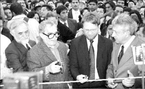 Apenas salió la comitiva del edificio del Antiguo Ayuntamiento, gran número de personas los rodearon; muchos jóvenes, con algún libro del escritor colombiano García Márquez, trataban de abrirse paso a empujones hacia el autor de Cien años de soledad, quien iba prácticamente protegido por el secretario de Gobierno, Alejandro Encinas, detrás del mandatario capitalino, el alcalde de Bogotá y el secretario de Cultura, Enrique Semo.