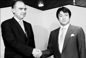 Fernando Canales Clariond y Shoichi Nakagawa, titulares de Economía de México y Japón, respectivamente, al término de una reunión en Tokio. La secretaría mexicana anticipó que la decimoprimera ronda de negociaciones entre ambos países para alcanzar un tratado de libre comercio concluirá de manera exitosa, y aseguró que la visita del presidente Vicente Fox dará impulso a las negociaciones. Señaló que el gobierno de México buscará concluir el proceso "tan pronto como sea posible para lograr un acuerdo mutuamente satisfactorio, equitativo y balanceado, que sea respaldado por los productores y exportadores mexicanos". Previamente a la llegada del presidente Fox a Japón, los equipos negociadores intensificaron los trabajos, con la intención de destrabar el tema agropecuario y, en especial, el relacionado con el ingreso de carne de puerco mexicana al mercado japonés FOTO AFP