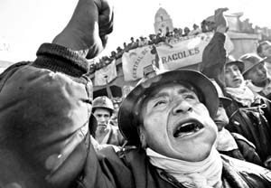 En La Paz, mineros del departamento de Oruro mastican hojas de coca mientras lanzan consignas contra Gonzalo Sánchez de Lozada, quien abandonó la presidencia boliviana ante el creciente repudio ciudadano y salió del país. Presuntamente, ya está en Miami en compañía de familiares FOTO AFP