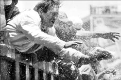 Son vehículos de carga pesada, sin lona para cubrirlos, en los que poco a poco se acomoda la gente. En el costado de uno se pueden observar los redondos impactos de balas. "Nos queremos ir antes de que sea de noche", expresa Carlos Quispe, "pero antes vamos a comer un poquito". En la banqueta, haciendo una jocosa cola, están los demás integrantes de la Federación de Cooperativistas Mineros de Huanuni, sus compañeros de Catavi y los jilacatas, ataviados con sombreros hechos de lana cruda, con ponchos rayados en rojo y negro, y cada uno con un látigo colgado al hombro: el símbolo de su autoridad y fuerza. "Nos han traído de almorzar", explica Quispe.