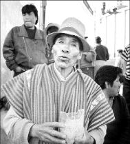 Cuando las bolsitas se acaban, los mineros van en busca de otros recipientes. Uno llega con cuatro envases de refresco, sacados de un montón de basura, que lavan y cortan para hacer cuencos. Uno de los jilacatas, cuyo poncho es verde brillante, se acerca con su plato lleno, pero antes de comenzar a comer empieza a hablar en aimara con suavidad y la mirada fija. Sus compañeros traducen: "Dile a tu compañero que me preste su cámara. Foto le he de sacar yo ahora para que sienta", y luego de otras palabras incomprensibles eleva al lente su comida y consiente orgulloso: "Sácame foto. ¿Por qué su poncho es de color tan vivo? Soy comisario. O sea que yo estoy a cargo de una fiesta en mi pueblo, allá por Huanuni. Somos mineros todos, y tenemos llamitas... por eso, pues, no traigo yo chicote".
