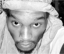del diablo. Bajo un turbante de tela hindú, su cara perforada y