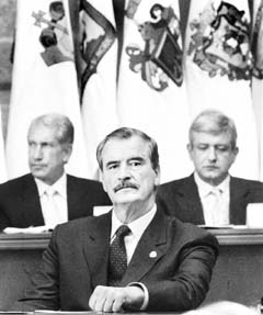 Vicente Fox encabezó en Palacio Nacional el acto donde se acordó que las negociaciones para la reforma hacendaria empezarán en febrero del próximo año. En el mismo espacio trascendió que el Ejecutivo prepara una nueva propuesta de reforma eléctrica que no incluye modificaciones constitucionales para abrir el sector al capital privado. Al fondo, el gobernador mexiquense Arturo Montiel y el jefe de Gobierno capitalino, Andrés Manuel López Obrador FOTO MARCO PELAEZ