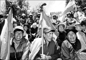 DEMANDA EN BOLIVIA  Familiares de los 80 bolivianos que murieron en los enfrentamientos entre policías, militares y población durante la llamada guerra del gas, ocurrida en octubre, comenzaron una huelga de hambre frente al recinto presidencial Palacio Quemado, en demanda de que se les indemnice con 120 mil bolívares (unos 16 mil dólares) FOTO AFP